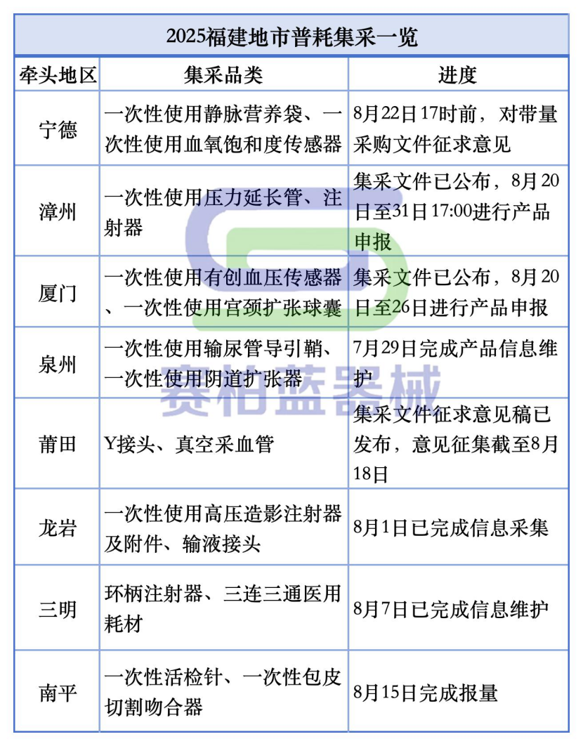 截至目前,福建漳州、廈門、寧德、南平、漳州、泉州、莆田、龍巖、三明均已發(fā)布相關通知,采購品類以低值耗材為主。