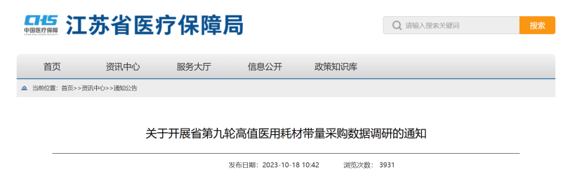 10月18日,江蘇省醫(yī)保局發(fā)布《關(guān)于開展省第九輪高值醫(yī)用耗材帶量采購(gòu)數(shù)據(jù)調(diào)研的通知》(以下簡(jiǎn)稱《通知》)。