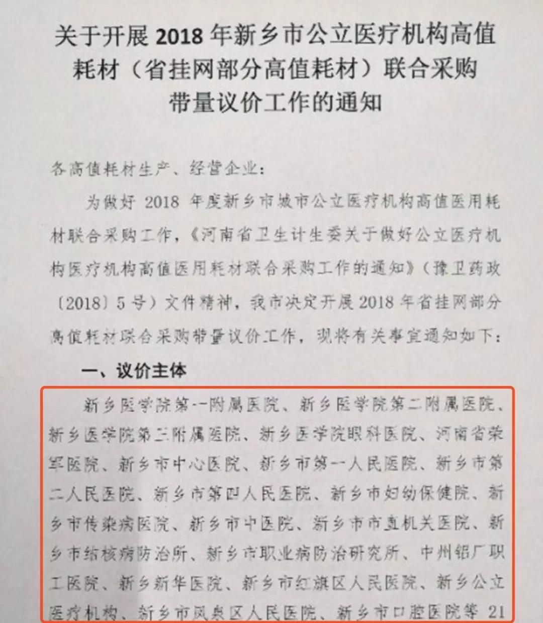 這份通知里稱,經(jīng)組織專家論證,在新鄉(xiāng)市用量大高值耗材中遂選出新鄉(xiāng)市公立醫(yī)療機構高值耗材聯(lián)合采購議價目錄(第一批)638個品規(guī)參與議價工作。按照議價規(guī)則,經(jīng)過專家議價,最終確定議價價格500個品規(guī)。