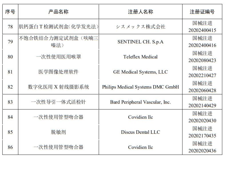 上述公告顯示,2020年9月,國(guó)家藥品監(jiān)督管理局共批準(zhǔn)注冊(cè)醫(yī)療器械產(chǎn)品86個(gè)。其中,境內(nèi)第三類醫(yī)療器械產(chǎn)品53個(gè),進(jìn)口第三類醫(yī)療器械產(chǎn)品16個(gè),進(jìn)口第二類醫(yī)療器械產(chǎn)品17個(gè)。
