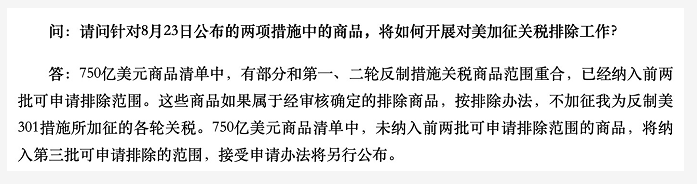 同時,文件指出,國務(wù)院關(guān)稅稅則委員會將繼續(xù)開展對美加征關(guān)稅商品排除工作,適時公布后續(xù)批次排除清單。