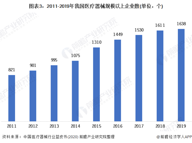 中國(guó)醫(yī)療器械產(chǎn)業(yè)由小到大,迅速發(fā)展,現(xiàn)已成為一個(gè)產(chǎn)品門類比較齊全、創(chuàng)新能力不斷增強(qiáng)、市場(chǎng)需求十分旺盛的朝陽(yáng)產(chǎn)業(yè)。近年來,國(guó)家積極出臺(tái)政策,完善醫(yī)療器械監(jiān)管政策,加大醫(yī)療政策的監(jiān)管力度,醫(yī)療器械行業(yè)在國(guó)家“調(diào)結(jié)構(gòu)”“轉(zhuǎn)方式”的指引下,保持了相對(duì)穩(wěn)定的發(fā)展速度。2019年我國(guó)醫(yī)療器械行業(yè)企業(yè)數(shù)為1638個(gè),較2018年增加了27個(gè)。