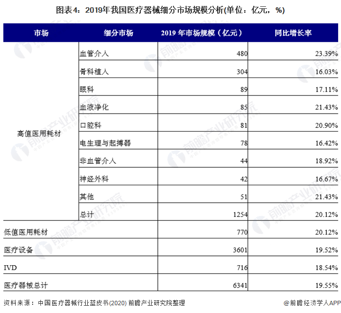 按醫(yī)械研究院分法,醫(yī)療器械可以分為高值醫(yī)用耗材、低值醫(yī)用耗材、醫(yī)療設(shè)備、IVD(體外診斷)四大類。其中根據(jù)使用用途不同,又可以將高值醫(yī)用耗材市場(chǎng)分為骨科植入、血管介入、神經(jīng)外科、眼科、口腔科、血液凈化、非血管介入、電生理與起搏器、其他共九小類。