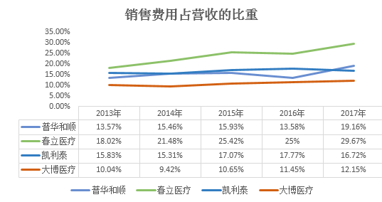 這樣的差距,更多體現(xiàn)在銷售費(fèi)用在總營收中的占比的不同。如下圖,大博醫(yī)療每年銷售費(fèi)用占營收的比重最低,且較為穩(wěn)定,逐年呈緩慢遞增狀態(tài)。而其他三家上市公司的比例雖然也不算高,但增幅卻有較為明顯的變化。