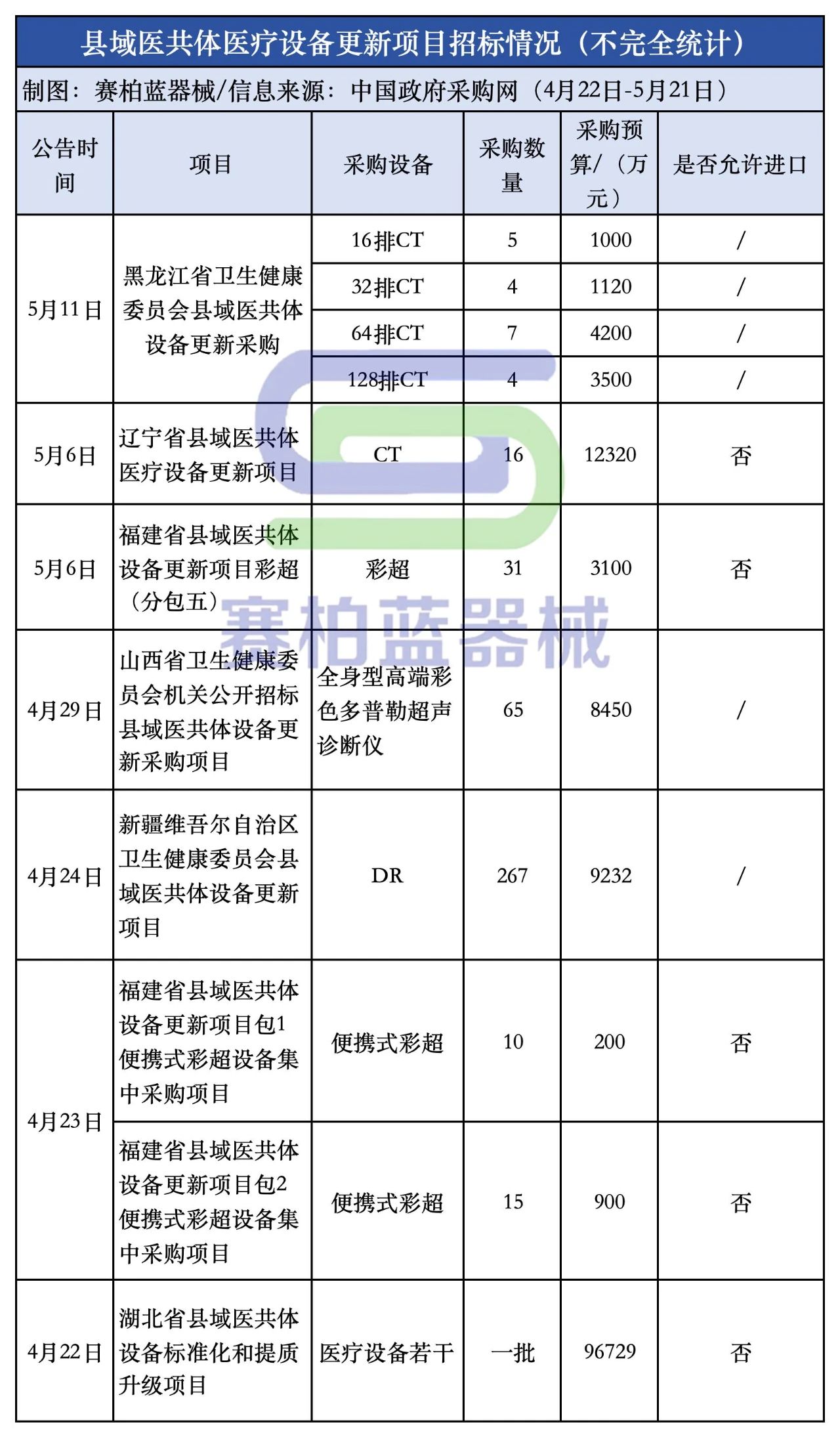2025年將是醫(yī)療設(shè)備市場的重要爆發(fā)期。據(jù)賽柏藍器械梳理,近一個月內(nèi),黑龍江、遼寧、福建、新疆、山西、湖北等多地開展縣域醫(yī)共體采購項目招標,招標預(yù)算超14億元。