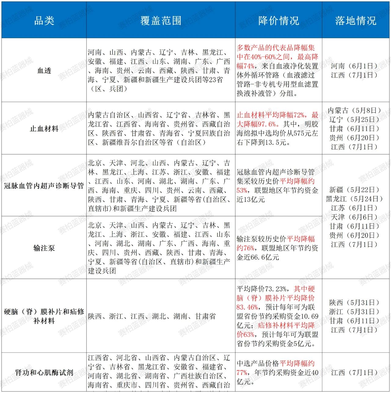 根據(jù)通知,河南聯(lián)盟血液透析類、內(nèi)蒙古聯(lián)盟止血材料類、浙江聯(lián)盟冠脈血管內(nèi)超聲診斷導管和輸注泵、陜西聯(lián)盟硬腦(脊)膜補片和疝修補材料以及江西牽頭的腎功和心肌酶試劑的集采中選結果,均將于7月1日在江西落地執(zhí)行。