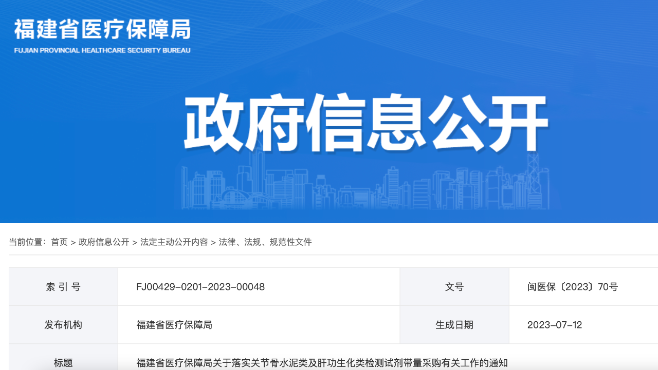 近日,福建醫(yī)保局發(fā)布《關(guān)于落實(shí)關(guān)節(jié)骨水泥類及肝功生化類檢測(cè)試劑帶量采購有關(guān)工作的通知》(簡(jiǎn)稱《通知》)。
