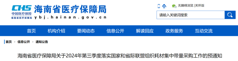 近日,海南省醫(yī)保局發(fā)布《海南省醫(yī)療保障局關于2024年第三季度落實國家和省際聯盟組織耗材集中帶量采購工作的預通知》。