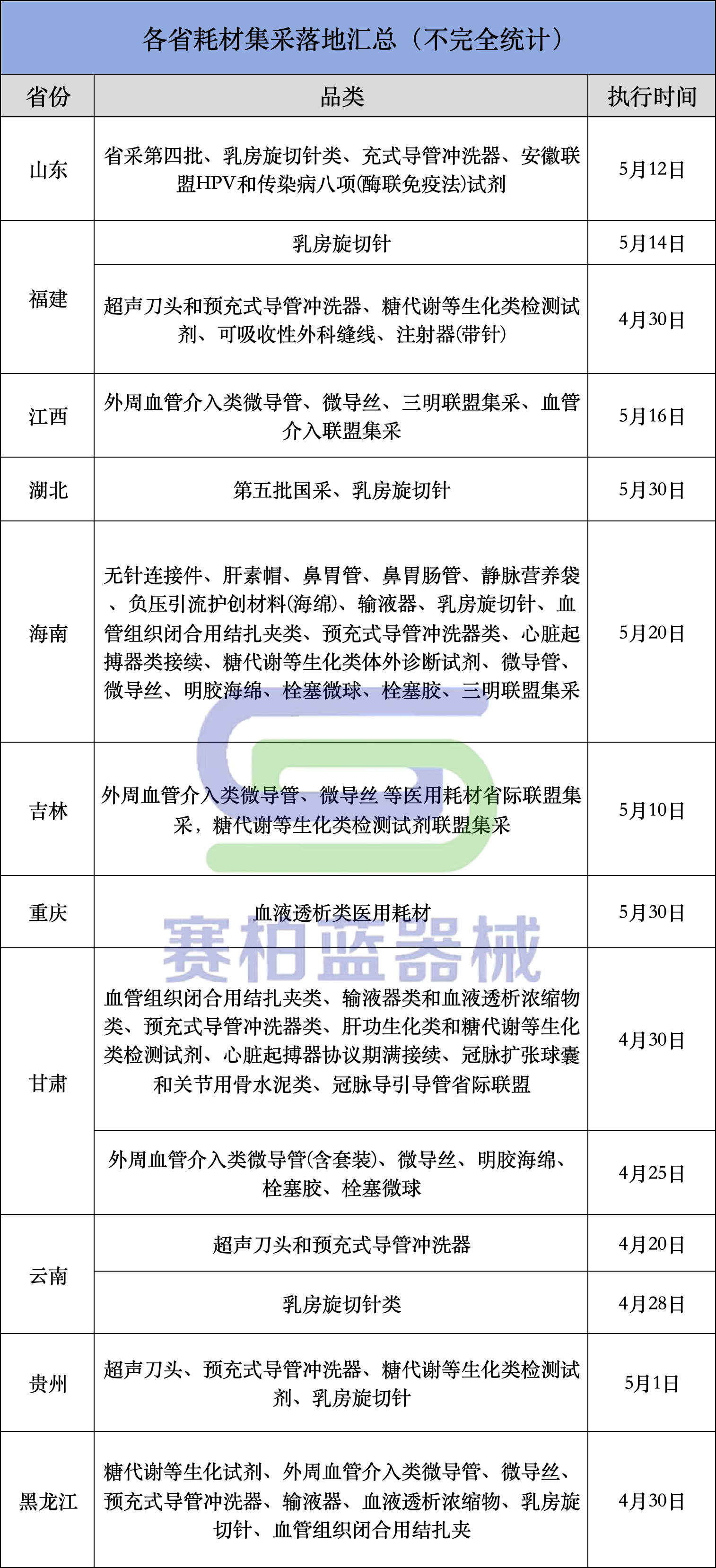 在各類新集采密集啟動的同時,已成完成的大規(guī)模聯盟集采正在密集落地。據賽柏藍器械不完全統(tǒng)計,僅4-5月就有超30類耗材執(zhí)行/將執(zhí)行新價格。具體如下: