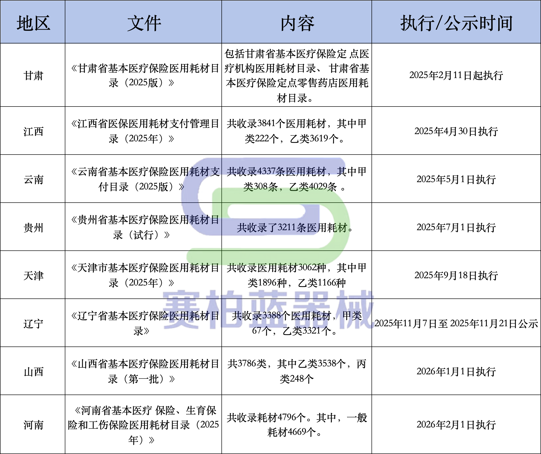 2025年是“十四五”的收官之年,據(jù)賽柏藍(lán)器械不完全統(tǒng)計(jì),除了山西外,云南、貴州、河南、天津、江西、河南等地也均在2025年公布醫(yī)保耗材目錄。