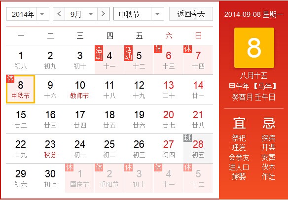 2014年北京華康普美科技有限公司,“秋季員工活動(dòng)”從9月4日(星期四)下午-9月5日(星期五);“中秋節(jié)”假期為:9月6日(星期六)、9月7日(星期日)、9月8日(星期一)共放假3天,9月9日(星期二)正常上班。