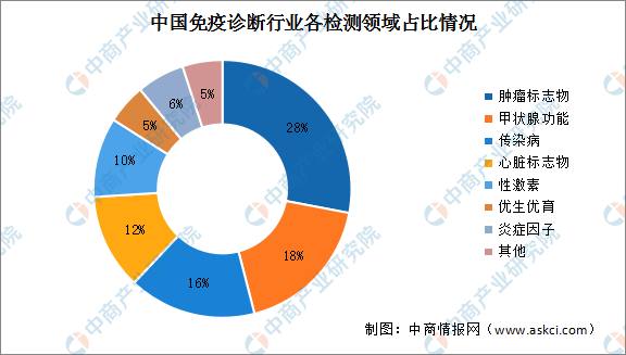 根據(jù)中商產(chǎn)業(yè)研究院統(tǒng)計(jì),從免疫診斷行業(yè)各個(gè)細(xì)分市場來看,腫瘤標(biāo)志物檢測、甲狀腺功能檢測和傳染病檢測是我國免疫診斷項(xiàng)目中,規(guī)模排名前三的領(lǐng)域。其中腫瘤標(biāo)志物檢測項(xiàng)目市場最大,占比達(dá)到28%。