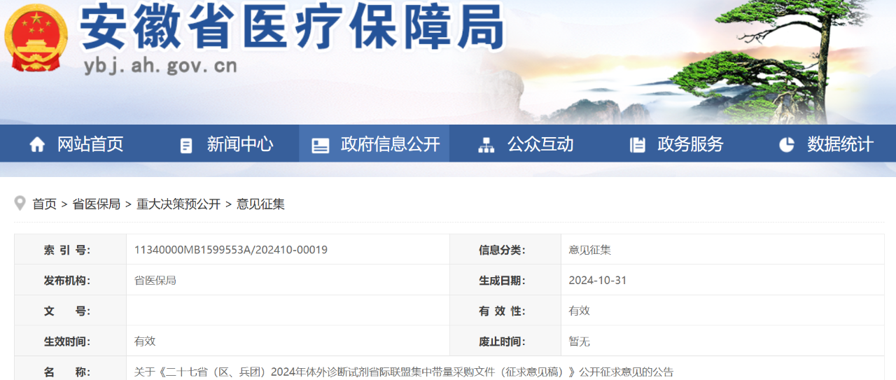 10月31日,安徽醫(yī)保局發(fā)布《二十七省(區(qū)、兵團)2024年體外診斷試劑省際聯(lián)盟集中帶量采購文件(征求意見稿)》(完整見文末)。