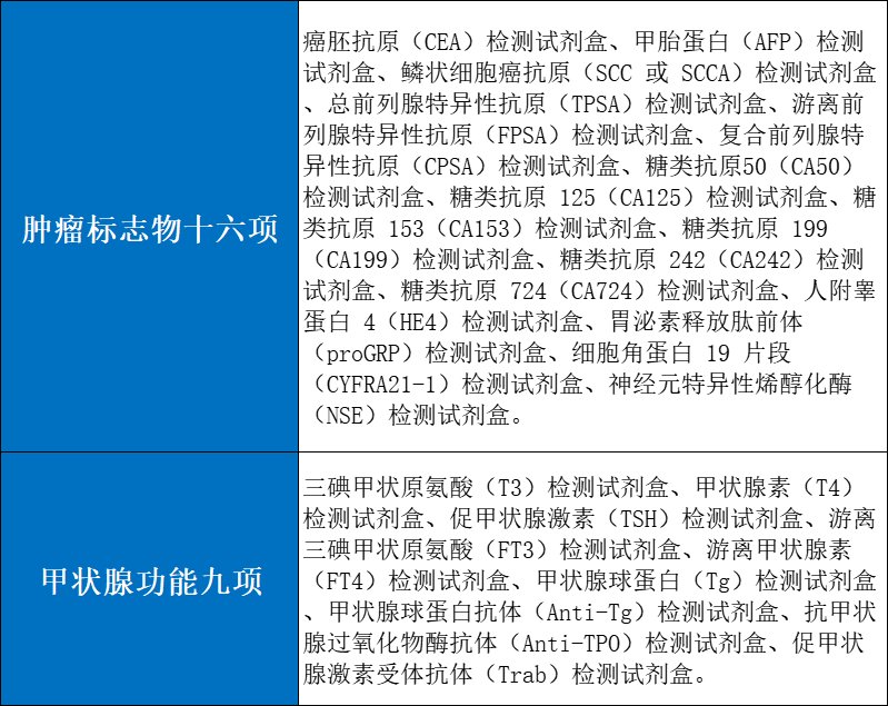 此次集采周期兩年,采購品種包括腫瘤標志物檢測產(chǎn)品十六項(化學發(fā)光法、流式熒光法、時間分辨免疫熒光法等)與甲狀腺功能檢測產(chǎn)品九項(化學發(fā)光法),具體如下: