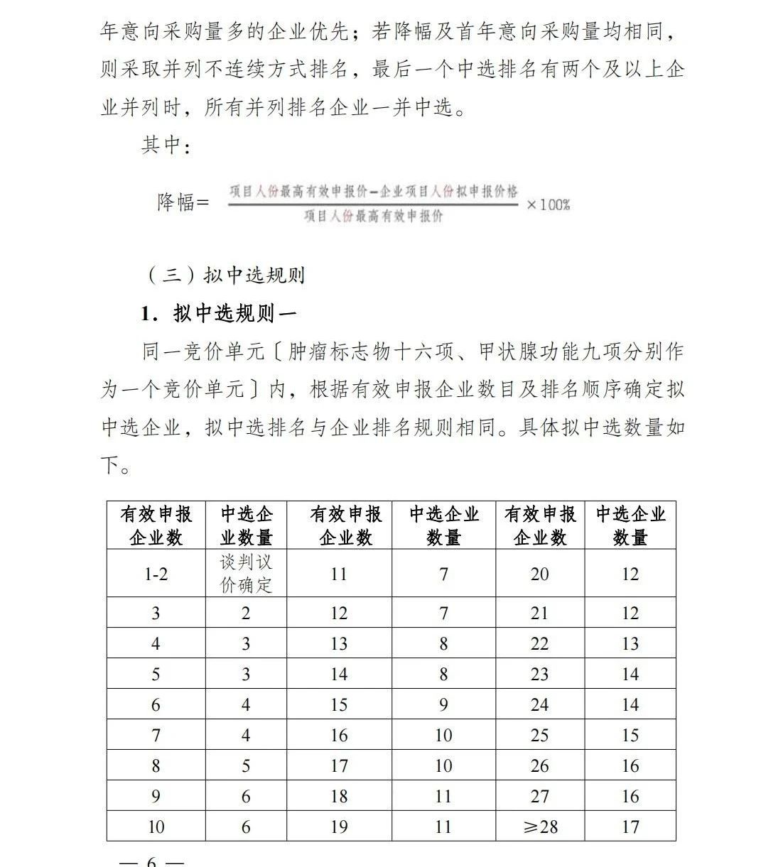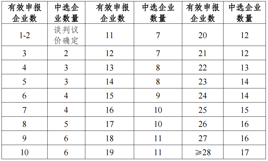 擬中選規(guī)則一:同一競價單元內(nèi)根據(jù)有效申報企業(yè)數(shù)目及排名順序確定擬中選企業(yè),具體擬中選數(shù)量如下: