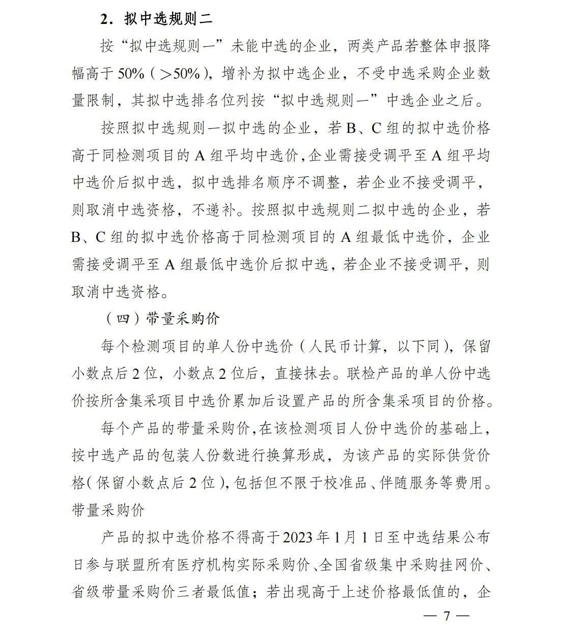按擬中選規(guī)則一未能中選的企業(yè),兩類產(chǎn)品若整體申報降幅高于50%增補為擬中選企業(yè),不受中選采購企業(yè)數(shù)量限制(具體規(guī)則見文末)。
