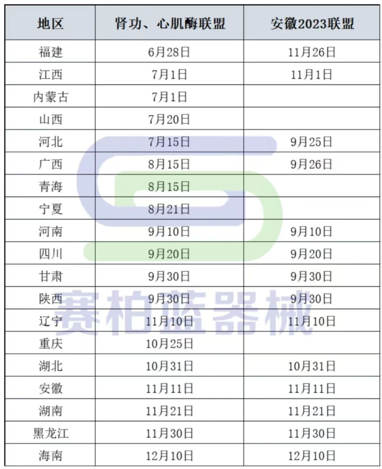 截至目前,全國(guó)多地已明確上述聯(lián)盟集采的執(zhí)行時(shí)間,其中肝功生化集采已全面落地完成,腎功心肌酶聯(lián)盟與安徽2023聯(lián)盟集采的進(jìn)度如下: