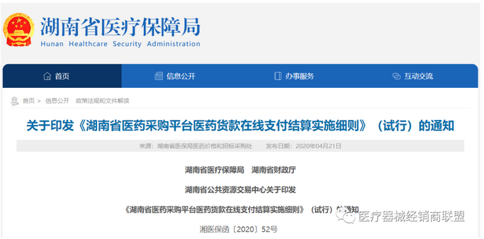 (4月21日),湖南省醫(yī)療保障局、湖南省財(cái)政廳以及湖南省公共資源交易中心聯(lián)合印發(fā)了《湖南省醫(yī)藥采購(gòu)平臺(tái)醫(yī)藥貸款在線支付結(jié)算實(shí)施細(xì)則》(試行)的通知(以下簡(jiǎn)稱《通知》)。