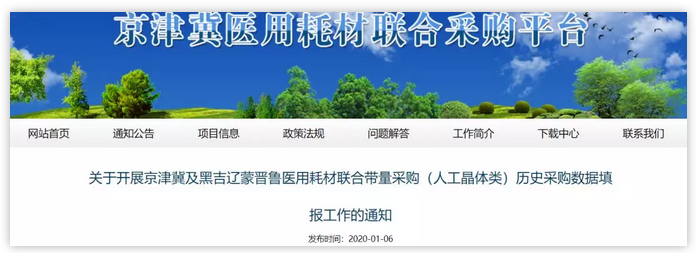 今日(1月6日),京津冀醫(yī)用耗材聯(lián)合采購平臺發(fā)布《關(guān)于開展京津冀及黑吉遼蒙晉魯醫(yī)用耗材聯(lián)合帶量采購(人工晶體類)歷史采購數(shù)據(jù)填報工作的通知》(下稱《通知》)。