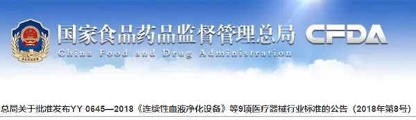 YY 0645—2018《連續(xù)性血液凈化設(shè)備》等9項醫(yī)療器械行業(yè)標(biāo)準(zhǔn)已經(jīng)審定通過,現(xiàn)予以公布。標(biāo)準(zhǔn)自2019年1月1日起實施,標(biāo)準(zhǔn)編號、名稱如下:
