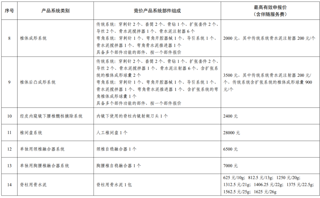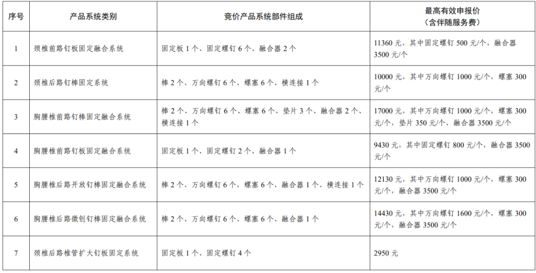 本次集采中,各產(chǎn)品系統(tǒng)類別主要部件按如下規(guī)則組成競價產(chǎn)品系統(tǒng),對應最高有效申報價(含伴隨服務費,骨水泥除外)如下: