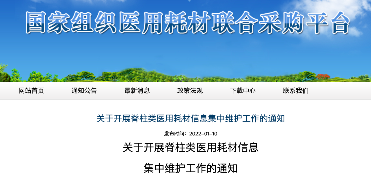 國(guó)家組織醫(yī)用耗材聯(lián)合采購(gòu)平臺(tái)脊柱類(lèi)醫(yī)用耗材產(chǎn)品信息集中維護(hù)時(shí)間:1月10日至1月26日。
