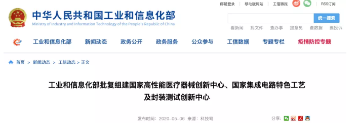 5月6日,國(guó)家工業(yè)和信息化部批復(fù)組建“國(guó)家高性能醫(yī)療器械創(chuàng)新中心”和“國(guó)家集成電路特色工藝及封裝測(cè)試創(chuàng)新中心”。