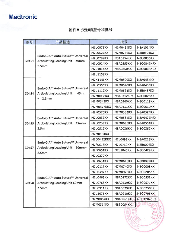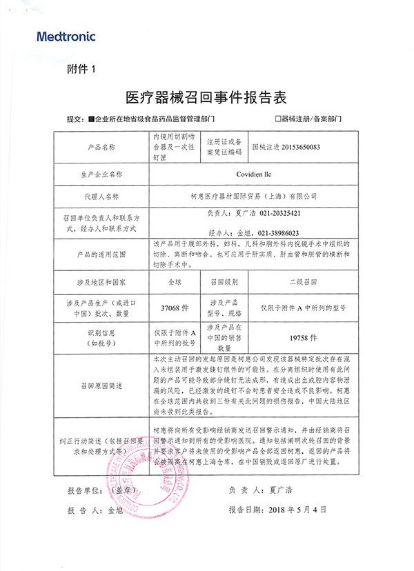 柯惠醫(yī)療器材國(guó)際貿(mào)易(上海)有限公司對(duì)內(nèi)鏡用切割吻合器及一次性釘匣主動(dòng)召回