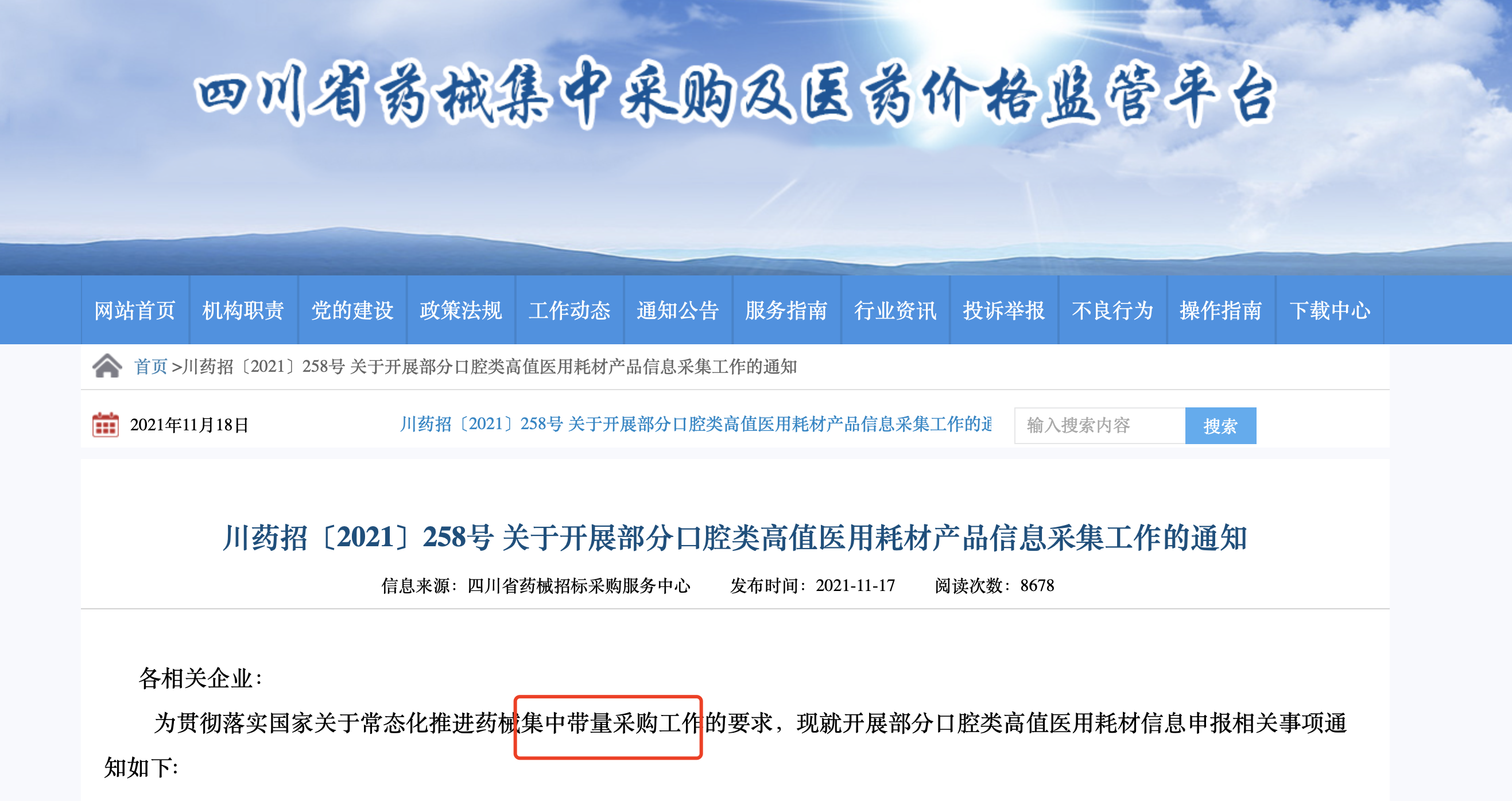 《通知》稱,為貫徹落實國家關(guān)于常態(tài)化推進藥械集中帶量采購工作的要求,現(xiàn)開展部分口腔類高值醫(yī)用耗材信息申報相關(guān)事項工作。