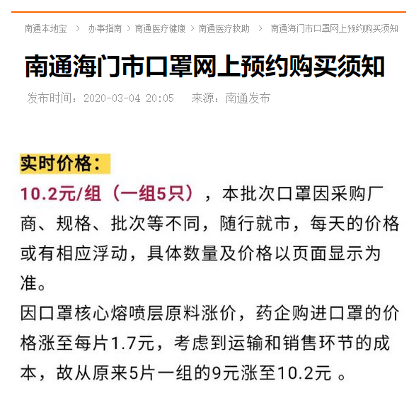 近日,南通本地寶轉發(fā)了南通發(fā)布一則通告:《南通海門市口罩網上預約購買須知》,由于口罩熔噴布價格的上漲,原本5片一組的口罩,由9元上漲至10.2元。價格上漲了13.3%。