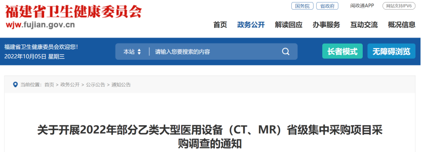 近日,福建省衛(wèi)健委發(fā)布《關(guān)于開展2022年部分乙類大型醫(yī)用設(shè)備(CT、MR)省級(jí)集中采購項(xiàng)目采購調(diào)查的通知》,近期擬開展2022年部分乙類大型醫(yī)用設(shè)備(CT、MR)集中采購工作。擬采購標(biāo)的包括:64排CT、1.5TMR、高端CT(256排及以上)、高端MR(3.0T及以上)。