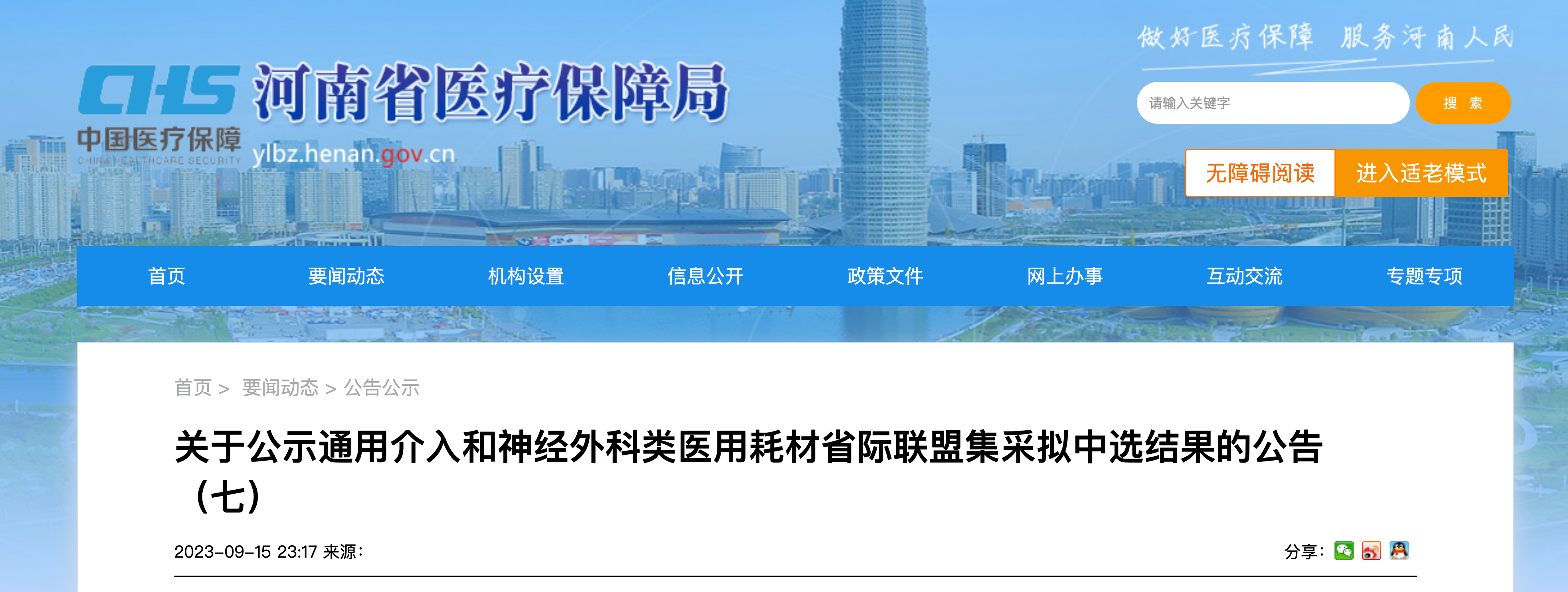 9月15日,河南省醫(yī)保局官網(wǎng)公布《關(guān)于公示通用介入和神經(jīng)外科類(lèi)醫(yī)用耗材省際聯(lián)盟集采擬中選結(jié)果的公告(七)》。