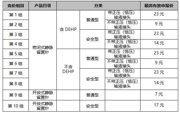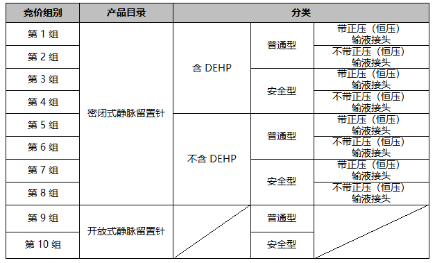 集采產(chǎn)品為國(guó)家醫(yī)療保障局醫(yī)保醫(yī)用耗材分類與代碼前7位為C160501開頭的留置針類醫(yī)用耗材。根據(jù)聯(lián)盟省份醫(yī)療機(jī)構(gòu)采購(gòu)需求,將申報(bào)企業(yè)的產(chǎn)品分為10個(gè)競(jìng)價(jià)組別。