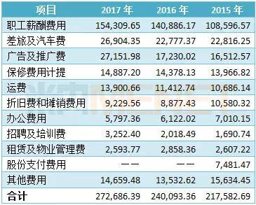 邁瑞醫(yī)療的銷售費用主要由職工薪酬費用、差旅及汽車費、廣告及推廣費等構(gòu)成。近年,其銷售費用均超過20億,2017年達27.27億元,占營收比例24.40%。