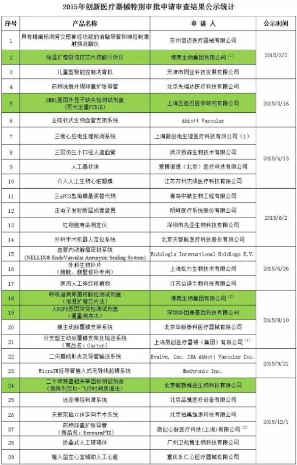 2015年共有29項產品進入CFDA創(chuàng)新醫(yī)療器械特別審批申請審查,其中上海微創(chuàng)有2項產品入圍,關于體外診斷的項目(背景為綠色)共有5項。