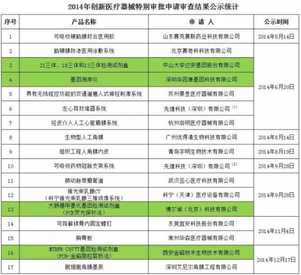 2014年共有17項產品進入CFDA創(chuàng)新醫(yī)療器械特別審批申請審查,其中先健科技(深圳)有限公司有2項產品入圍,關于體外診斷的項目(背景為綠色)共有4項。