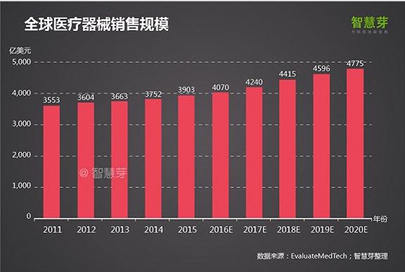 根據(jù)EvaluateMedTech的統(tǒng)計,2011-2015全球醫(yī)療器械銷售規(guī)模呈現(xiàn)穩(wěn)步上升趨勢。2015年,銷售額達到3900億美元以上。預(yù)計該市場規(guī)模在2020年增長至4775億美元,2015-2020期間將呈現(xiàn)4.1%的年均復(fù)合增長率。