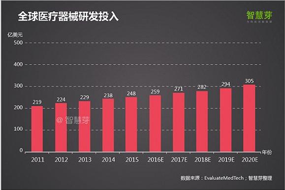 與此同時,全球醫(yī)療器械市場的研發(fā)投入也保持著穩(wěn)定增長態(tài)勢,2015年達到248億美元。