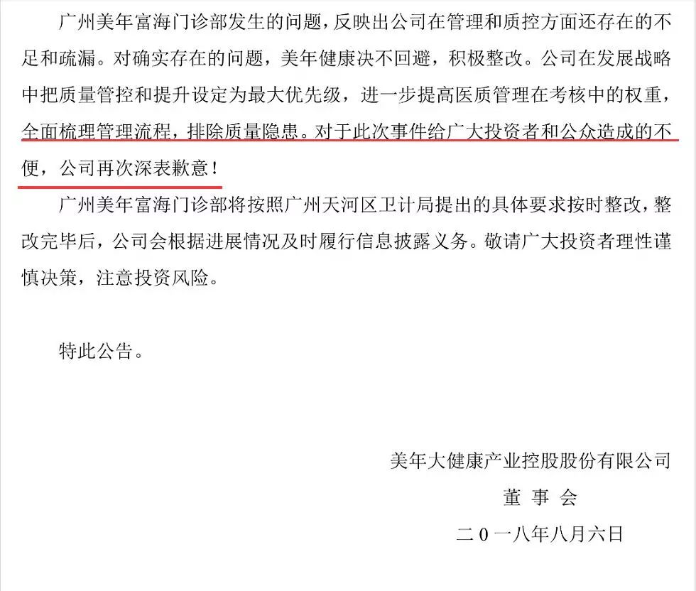 廣州美年富海門診部發(fā)生的問題,反映出公司在管理和質(zhì)控方面還存在的不 足和疏漏。對確實存在的問題,美年健康決不回避,積極整改。公司在發(fā)展戰(zhàn)略 中把質(zhì)量管控和提升設(shè)定為最大優(yōu)先級,進一步提高醫(yī)質(zhì)管理在考核中的權(quán)重, 全面梳理管理流程,排除質(zhì)量隱患。對于此次事件給廣大投資者和公眾造成的不便,公司再次深表歉意!