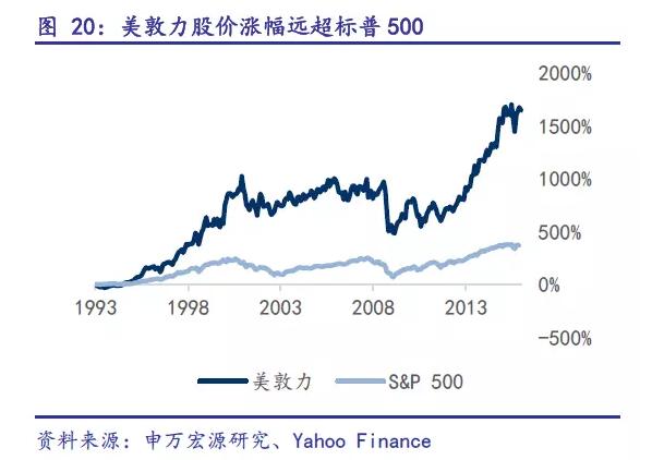 隨著并購(gòu)的進(jìn)行,美敦力營(yíng)業(yè)收入持續(xù)增長(zhǎng),2015年?duì)I業(yè)額僅次于強(qiáng)生醫(yī)療,成為全球醫(yī)療器械巨頭。其二級(jí)市場(chǎng)股票價(jià)格的表現(xiàn)也非常優(yōu)秀,遠(yuǎn)遠(yuǎn)跑贏標(biāo)普500 指數(shù)。