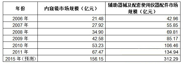 隨著內(nèi)窺鏡微創(chuàng)技術(shù)的普及和內(nèi)窺鏡加工工藝的提高,內(nèi)窺鏡應(yīng)用已涉及普外科、耳鼻喉科、骨科、泌尿外科、婦科等幾乎所有科室,成為醫(yī)用不可或缺的診斷和手術(shù)設(shè)備,也是全球醫(yī)療器械產(chǎn)業(yè)中增長最快的產(chǎn)品之一。發(fā)展中國家醫(yī)療水平的提高和醫(yī)療投資的加大,使內(nèi)窺鏡應(yīng)用不再局限于歐美發(fā)達國家,中國、印度、巴西等發(fā)展中國家市場需求量正快速增長。2011年全球醫(yī)用內(nèi)窺鏡市場規(guī)模為61億美元,預(yù)計到2016年將增長到97億美元。2011年,我國醫(yī)用內(nèi)窺鏡行業(yè)工業(yè)總產(chǎn)值約為50.65億元元,凈進口16.82億元,國內(nèi)實際需求量達到67.47億元,到2015年該數(shù)值有望增長到156.15億元。與醫(yī)用內(nèi)窺鏡市場需求量快速增長一致,我國微創(chuàng)手術(shù)器械、影像系統(tǒng)、冷光源等醫(yī)用內(nèi)窺鏡配套器械產(chǎn)業(yè)發(fā)展迅速,內(nèi)窺鏡配套器械市場規(guī)模保持在內(nèi)窺鏡市場規(guī)模的2倍左右,2011年達到134.97億元,預(yù)計2015年將增至312.29億元。