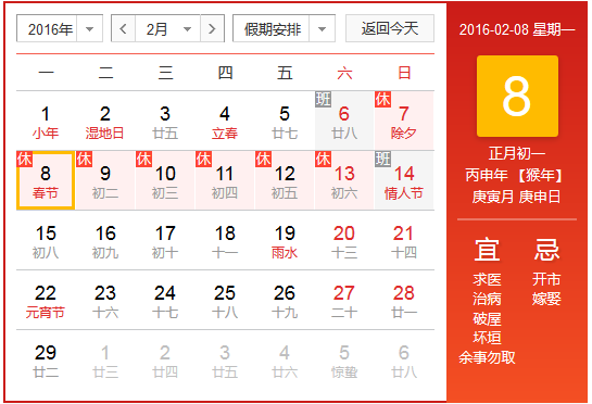 根據(jù)國家規(guī)定,北京華康普美2016年春節(jié)放假安排如下:2016年2月7日至2016年2月13日放假,共7天。春節(jié)前2月6日(星期六)上班,春節(jié)后2月14日(星期日)正常上班。