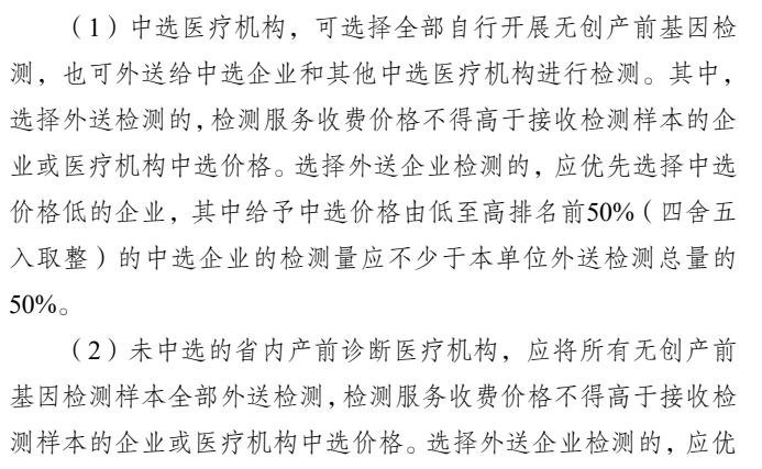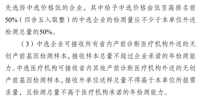 參與醫(yī)療機(jī)構(gòu)中選規(guī)則方面,“所有符合要求的申報(bào)參與產(chǎn)前診斷醫(yī)療機(jī)構(gòu)同組競(jìng)價(jià),報(bào)價(jià)不高于最高有效申報(bào)價(jià)(345元)的中選。醫(yī)療機(jī)構(gòu)應(yīng)事先與相關(guān)檢測(cè)試劑生產(chǎn)企業(yè)協(xié)商解決相關(guān)檢測(cè)試劑供應(yīng)及價(jià)格事項(xiàng),確保能正常開展檢測(cè)操作完成檢測(cè)任務(wù)量”。