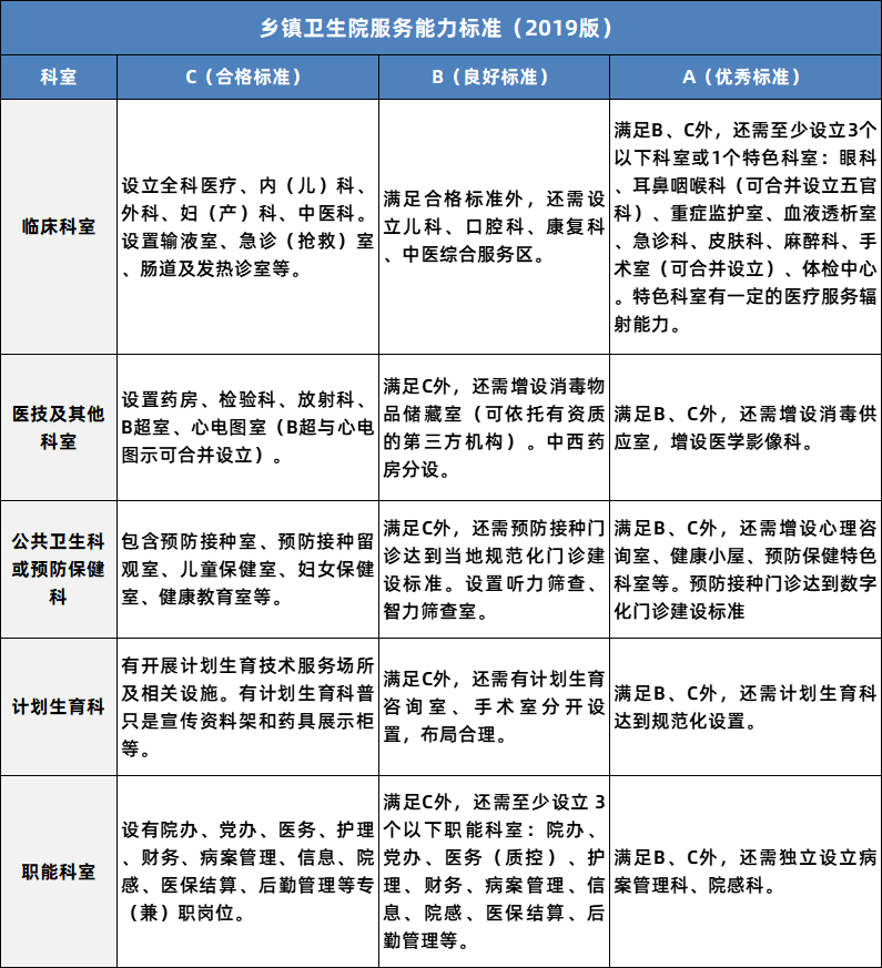 2018年,國家衛(wèi)健委第一次印發(fā)《關(guān)于開展“優(yōu)質(zhì)服務(wù)基層行”活動(dòng)的通知》,同時(shí)制定了鄉(xiāng)鎮(zhèn)衛(wèi)生院、社區(qū)衛(wèi)生服務(wù)中心服務(wù)能力標(biāo)準(zhǔn)。2019年,鄉(xiāng)鎮(zhèn)衛(wèi)生院、社區(qū)衛(wèi)生服務(wù)中心服務(wù)能力標(biāo)準(zhǔn)得到更新。