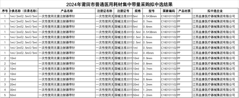 3月12日,福建莆田市一次性使用無(wú)菌普通型注射器集采擬中選結(jié)果公布。