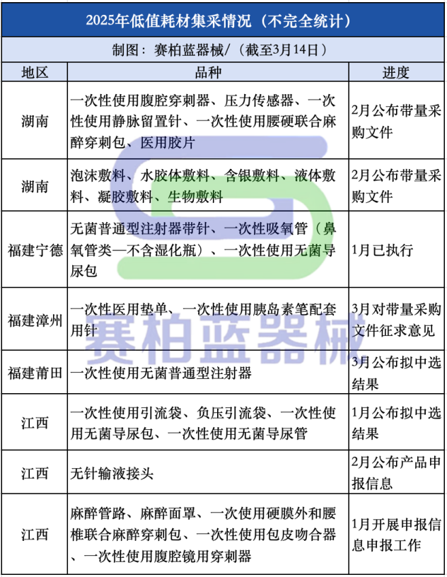 除福建外,江西、湖南、內(nèi)蒙古等多地近期低值耗材集采動(dòng)作密集。其中,江西此前已推進(jìn)由地級(jí)市或頭部醫(yī)院牽頭的全省普耗集采,2025年已開展3大項(xiàng)目,分別由宜春、撫州、九江方面牽頭。