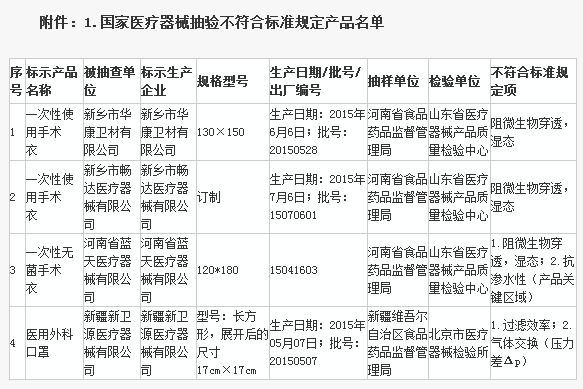 (一)手術(shù)衣3家企業(yè)3批次產(chǎn)品。新鄉(xiāng)市華康衛(wèi)材有限公司、新鄉(xiāng)市暢達(dá)醫(yī)療器械有限公司生產(chǎn)的各1批次一次性使用手術(shù)衣,〔阻微生物穿透,濕態(tài)〕不符合標(biāo)準(zhǔn)規(guī)定;河南省藍(lán)天醫(yī)療器械有限公司生產(chǎn)的1批次一次性無菌手術(shù)衣,〔阻微生物穿透,濕態(tài)〕、抗?jié)B水性(產(chǎn)品關(guān)鍵區(qū)域)不符合標(biāo)準(zhǔn)規(guī)定。