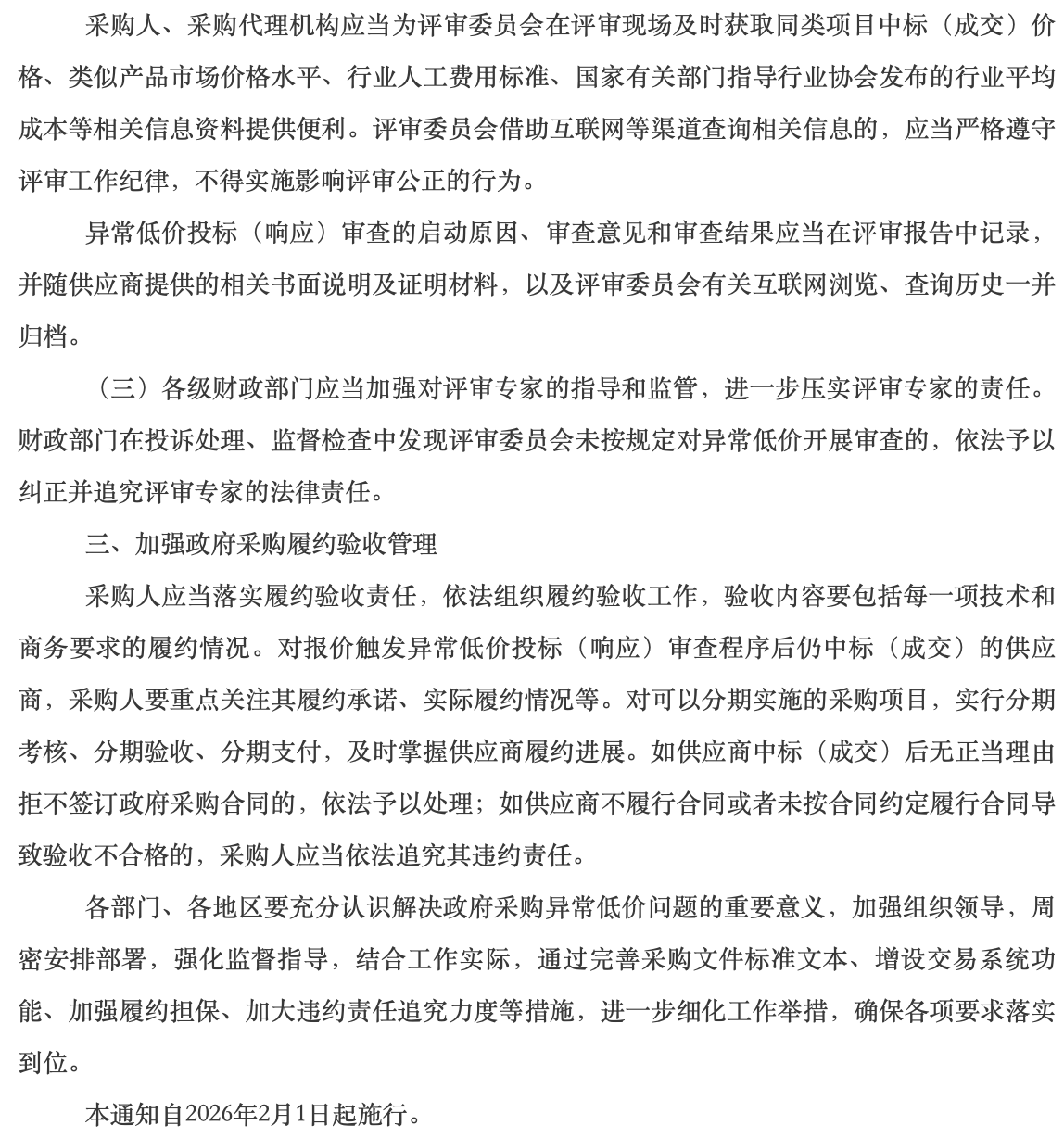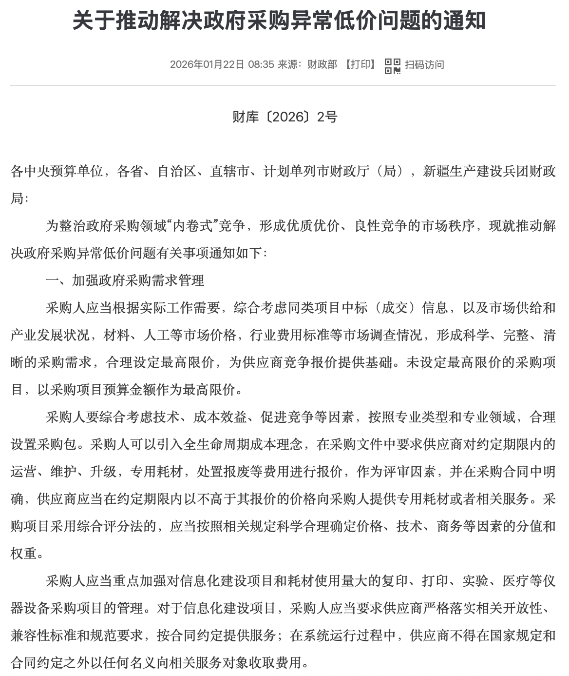 近日,財(cái)政部發(fā)布《關(guān)于推動(dòng)解決政府采購異常低價(jià)問題的通知》(以下簡(jiǎn)稱《通知》,附文末),其中顯示,為整治政府采購領(lǐng)域“內(nèi)卷式”競(jìng)爭(zhēng),形成優(yōu)質(zhì)優(yōu)價(jià)、良性競(jìng)爭(zhēng)的市場(chǎng)秩序,現(xiàn)就推動(dòng)解決政府采購異常低價(jià)問題有關(guān)事項(xiàng)通知,該文件自2026年2月1日起施行。