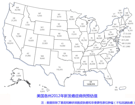 圖1:美國(guó)各州2012年新發(fā)癌癥病例預(yù)估值