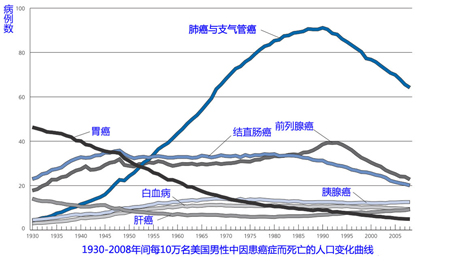 圖2:1930-2008年間每10萬(wàn)名美國(guó)男性因患癌而死亡的人口變化曲線